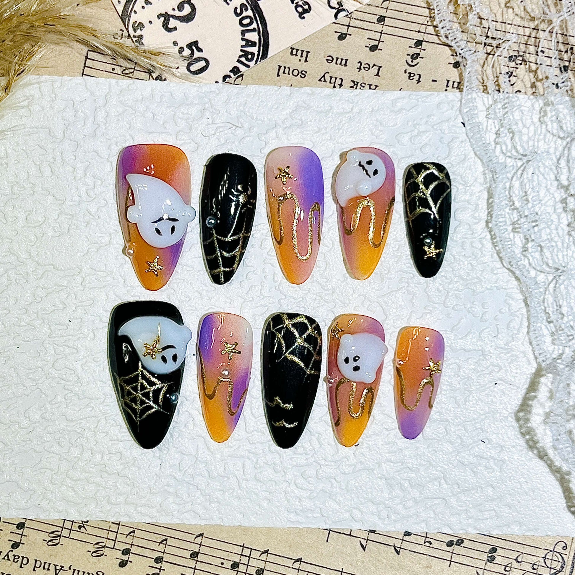 Spooky Ghost & Spiderweb Handmade Acrylic Press-On Nails | Easy Stick on| Halloween Reusable Manicure | Fake Nails False Nails