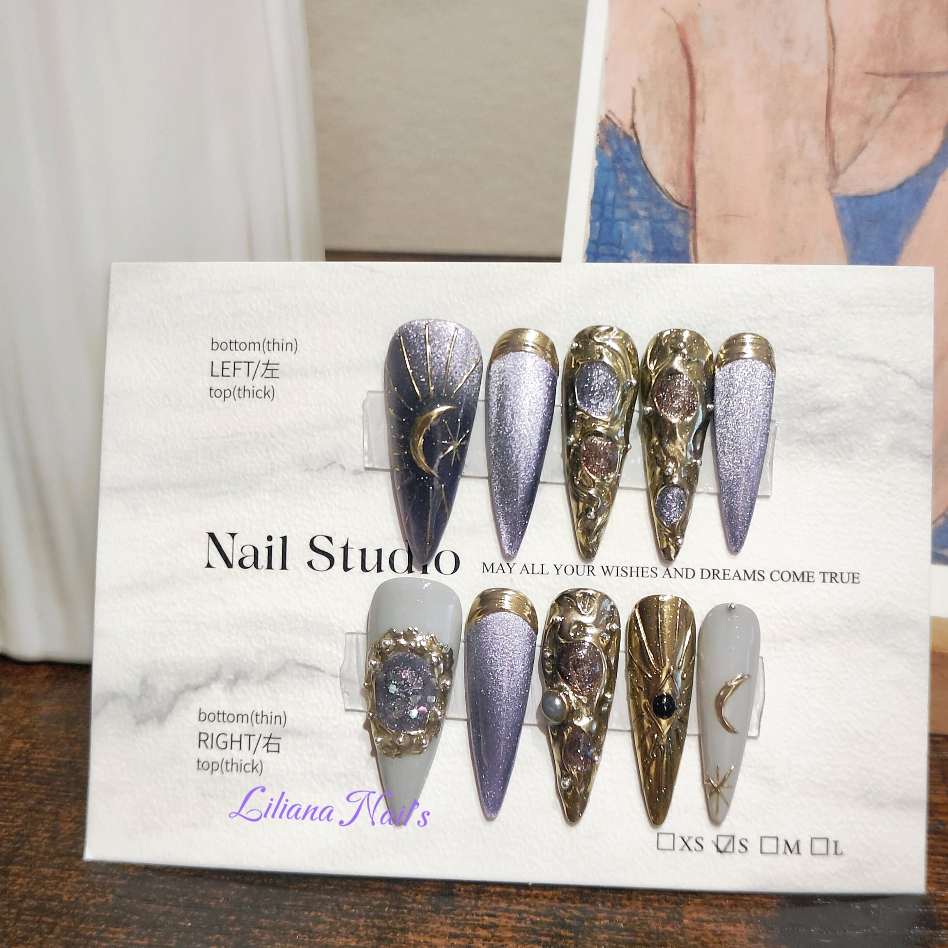 Starry Night Cat Eye Stiletto Handmade Acrylic Press-On Nails| Edgy Reusable Manicure| Fake Nails False Nails Stick on Nails